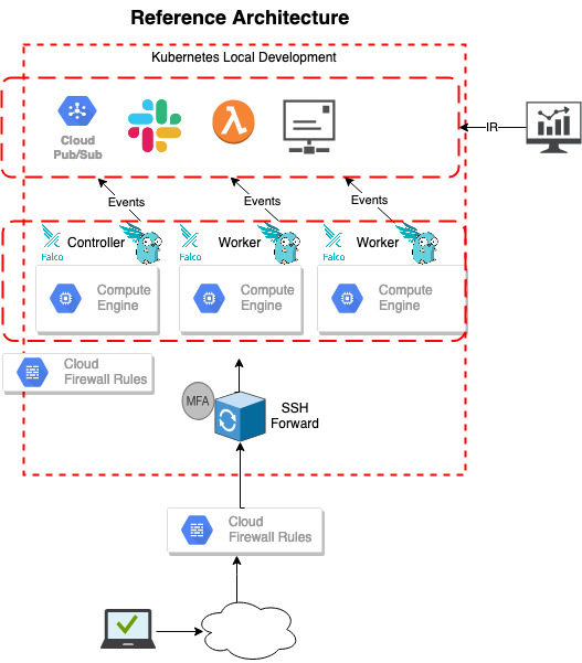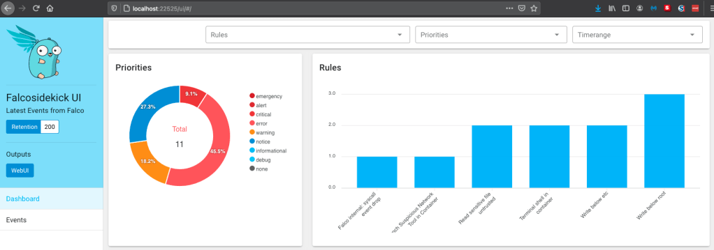 Falco comes with an insecure Web Interface that you can optionally deploy as part of your test / troubleshooting. There is no authentication or encryption in transit is disabled by default. In my development environment, I’m using a bastion host with network ACLs to enforce authentication but the ideally you would forward to a more enterprise ready Web Application or you could modify the vue.js controller with an authentication node.js module yourself.