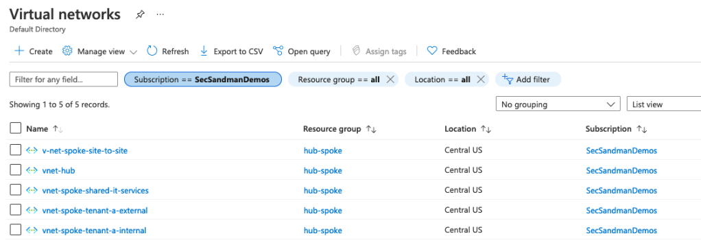 I personally used a single subscription in my lab but ideally you’d create separate subscriptions for each Tenant’s VNET then you can cleanly map Azure AD groups to subscriptions and ultimately the resources within that subscription and that network. You’d end up up with something like an “App-Team AD group” and “Network Roles” AD Group, where the network roles manage the subscription assets VNET that we’re building in this exercise.