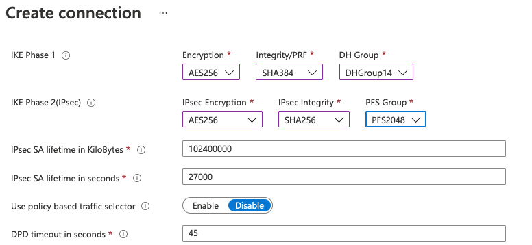 | Traffic Selector | UsePolicyBasedTrafficSelectors** ($True/$False; Optional, default $False if not specified) |