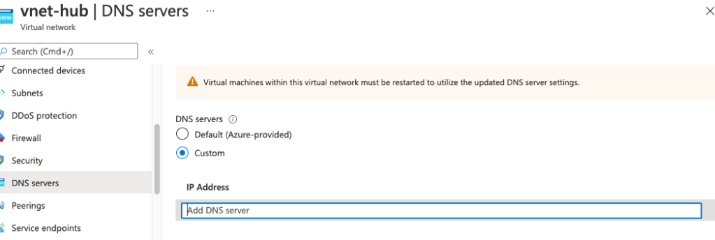 This is a brief note on configuring DNS servers in the Azure virtual networks. At a later date, I’ll be doing this lab end-to-end with some Microsoft DNS services tied to AD. The important takeaway here is that Azure virtual network supports either azure provided or custom private DNS servers.