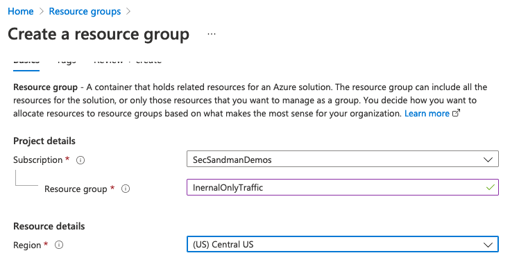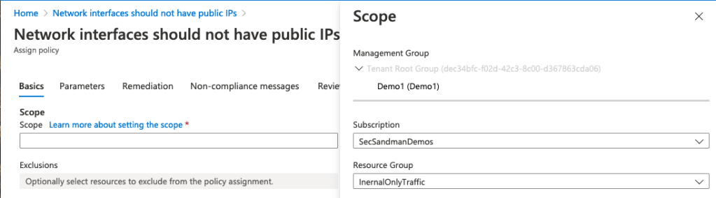 In this example, I created a separate logical resource group (InternalOnlyTraffic) under a shared SecSandmanDemos subscription and applied the hardening network policy to InternalOnlyTraffic then moved the old VNET into the new resource group so the policy would cover the internal VNET.