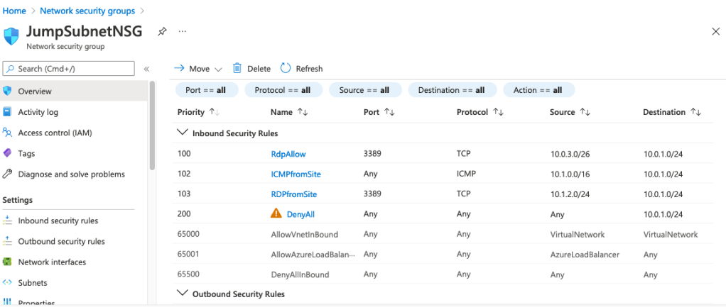 In this deployment, Network Security Groups are deployed and attached at the subnet level. A DenyAll is given higher priority by default and some limited RDP and ICMP traffic is allowed from JumpHost subnets for testing purposes.