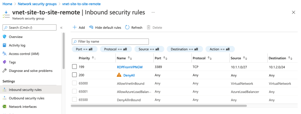 The above examples, explicitly deny all inbound traffic and then only allow RDP traffic at the moment from the VPN Gateway subnet pool. I’ve purposefully left the egress rules relaxed for intra- VNET (East-West )traffic but be aware the risks of data exfiltration and remote command and control scenarios. In this case, assuming the route tables work as expected, the virtual firewall will capture intra-VNET, internet bound and external VNET bound traffic and enforce a separate set of network packet or FQDN filtering rules.
