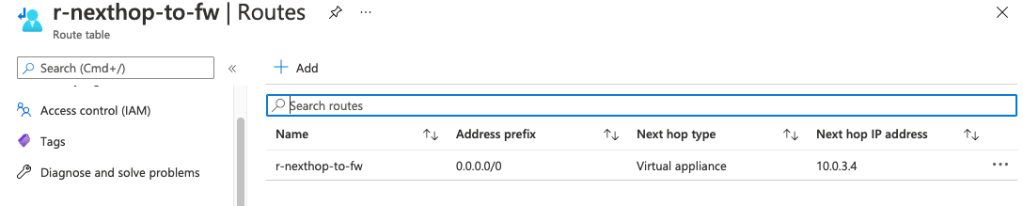 Don’t forget to configure your local on-premise lab VPN with similar parameters as above so the IKE handshake reaches agreement and establishes a connected tunnel. You will also be asked to use a PSK (pre-shared-key). Ensure you use a very long long randomly generated key. Finally, ensure the VPN GatewaySubnet route direct all on-premise traffic to the Azure Firewall virtual appliance.