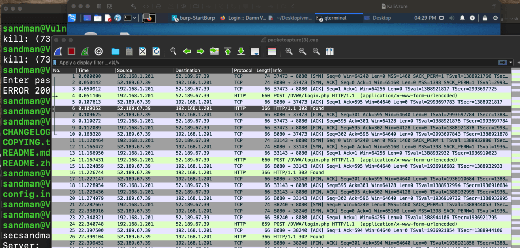 I attempted some 1,050 brute force attempts against the Damn Vulnerable Web Application (DVWA) hosted in Azure using Burp HTTP Intruder. This attack originated from the internet ingress to the Azure FW public IP over a SSH DNAT and I wanted to test whether the product could pick up TCP brute force client tcp rates or user-agents…. I doubted the product would alert on brute-force given the high transactions rates expected from the internet to HTTP typically to support most business functions but maybe HTTP client user-agent since the traffic is unencrypted?