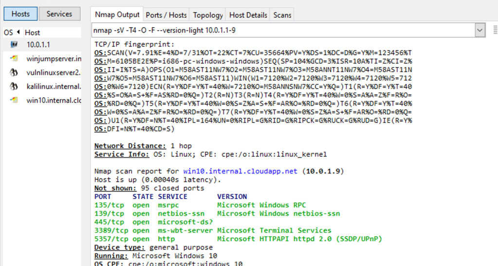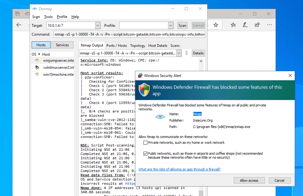 Okay, so I began to suspect that the detection functionality from the internet is somewhat constraining the features of the Azure FW IDPSs. As an educated guess, I suspected that the signatures needed more handshake data between client and server. I had a strong suspicion that Microsoft would excel at SMB type of attacks and enumerations as well…. So I deployed a Windows 10 preview in Azure, stood up a few other VMs, had disabled some local security features to get NMAP to run and then point and shot off the same scripts as before ….