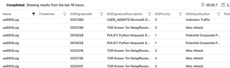- The Azure firewall IDPS had a difficult time detecting basic nmap network enumerations from the internet but did provide the logs within a few minutes. In theory the Azure FW logs could be scripted for automated alerts or sent to Azure Sentinel / Splunk etc for pattern matching