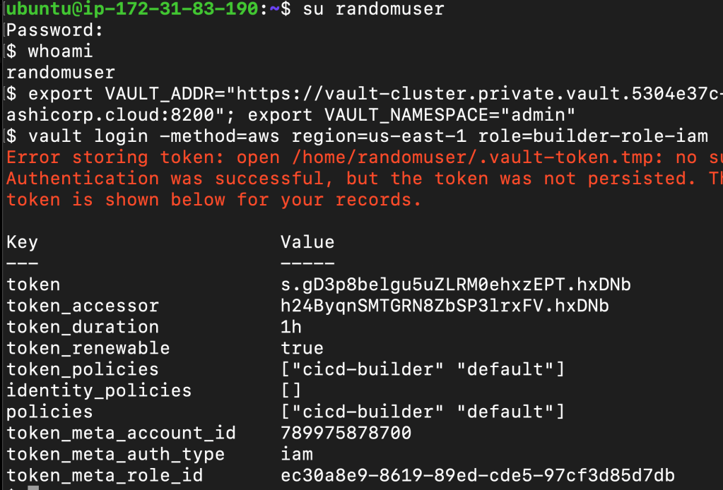 Instead the vault clients sent the AWS STS token to VAULT and in exchange VAULT handed over it’s own token for subsequent use. BTW, these tokens should NOT be printed to screen and there is an argument to keep them out of your logs.