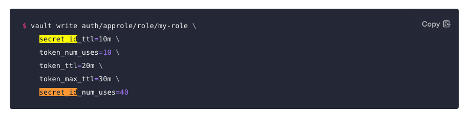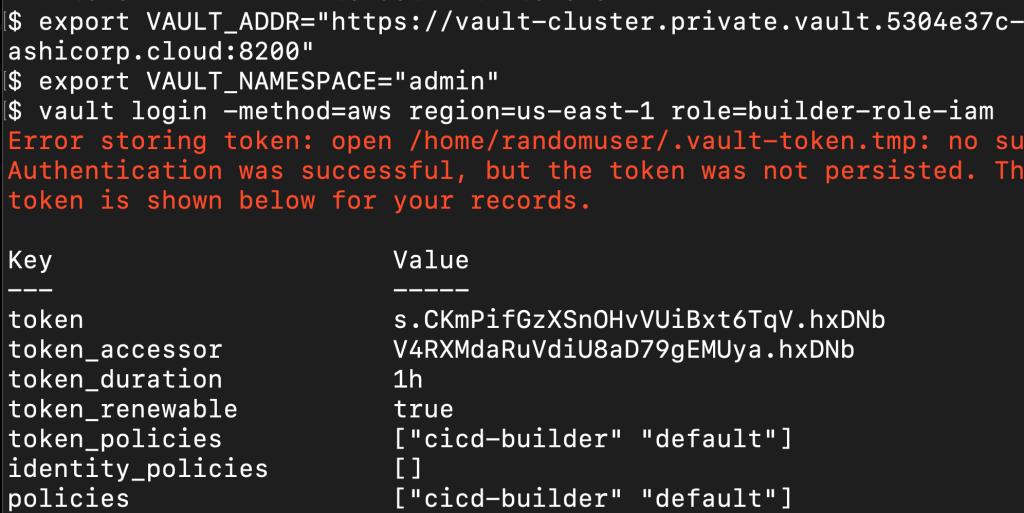 bound_iam_principal_arn=arn:aws:iam::12345678910:role/vault_authn_builder policies=cicd-builder max_ttl=1h
