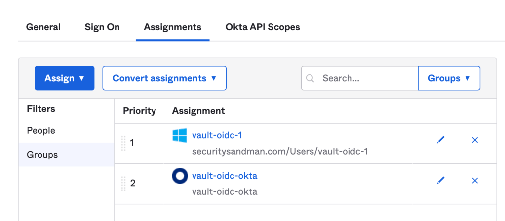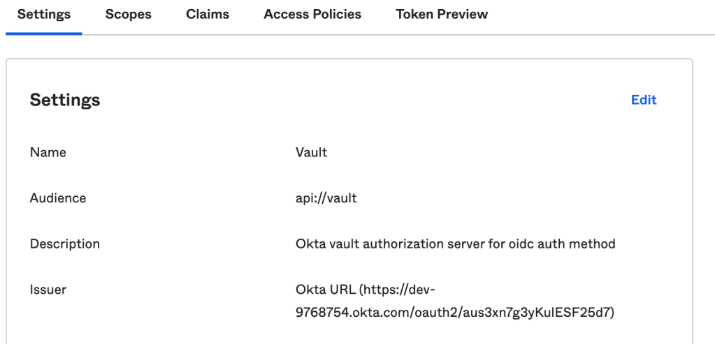 This essentially, set up your Okta authorization server to provide specific scopes for your application and specific claims. One of which being group membership which the VAULT application can use for multi-tenancy and authorization.