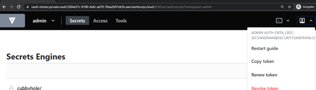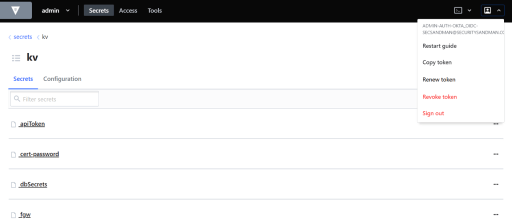 Finally, attempt to log again using an incognito window… and you’ll see the secsandman@securitysandman.com is not only authenticated but also authorized to manage the KV secrets store in VAULT.
