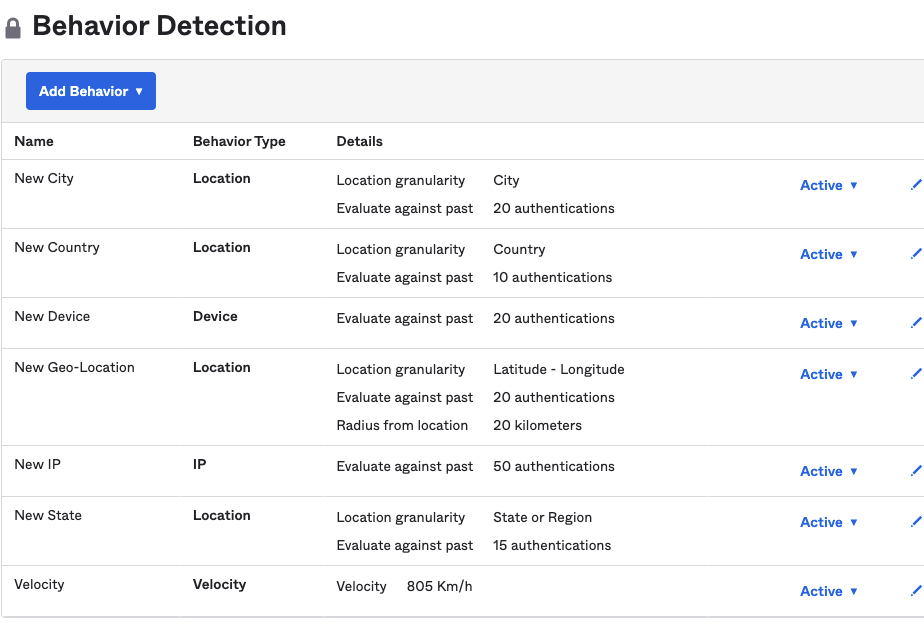 Let’s talk about behavior detections a nice added bonus… Okta behavior detection enables you to configure sign-on policy rules that take into account changes in user behavior. For example, you can configure a policy to require multifactor authentication if a user signs in from a new location or using a new device.