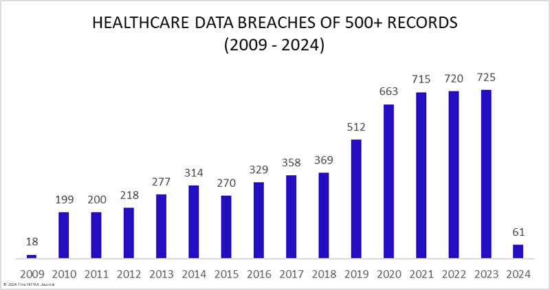 In 2023, the healthcare sector saw 725 data breaches reported to the Office for Civil Rights, marking a record year for both the number of breaches and the volume of records compromised, with over 133 million records exposed. This trend represents a significant increase in data breaches within the healthcare sector over the years, underscoring the growing challenge of protecting patient data against cyberattacks and unauthorized disclosures. For detailed statistics and trends on healthcare data breaches, you can visit HIPAA Journal’s website on healthcare data breach statistics.