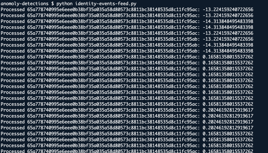 The “fake attacker logs” generated from the previous section mimic possible data leakage and possible attacks on our GitHub CICD system. We can then feeds these events to our AI models inference endpoints (APIs) and receive anomaly scores which should in return indicate whether these events are worth investigating further.