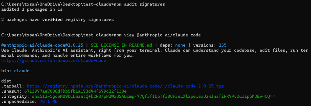 npm audit signatures) - Standard package integrity hashes (shasum, integrity)